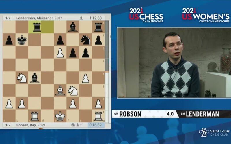 Grandmaster Maurice Ashley talks to Alex Lenderman during Round 6 of the 2021 U.S. Chess Championships. 2021.10.12 USChessChamps.com