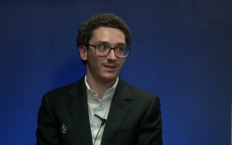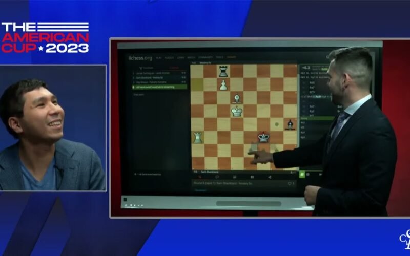 Read moreFabiano Caruana talks to Cristian Chirila after his Game 2 draw in the first round of The American Cup 2023