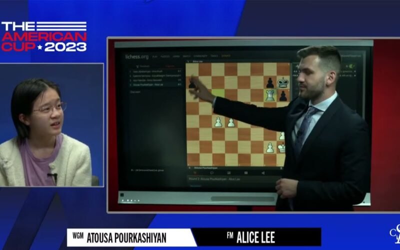 Read moreAlice Lee talks to Cristian Chirila after her Game 2 victory in the first round against Atousa Pourkashiyan. 2023.03.18 USChessChamps.com