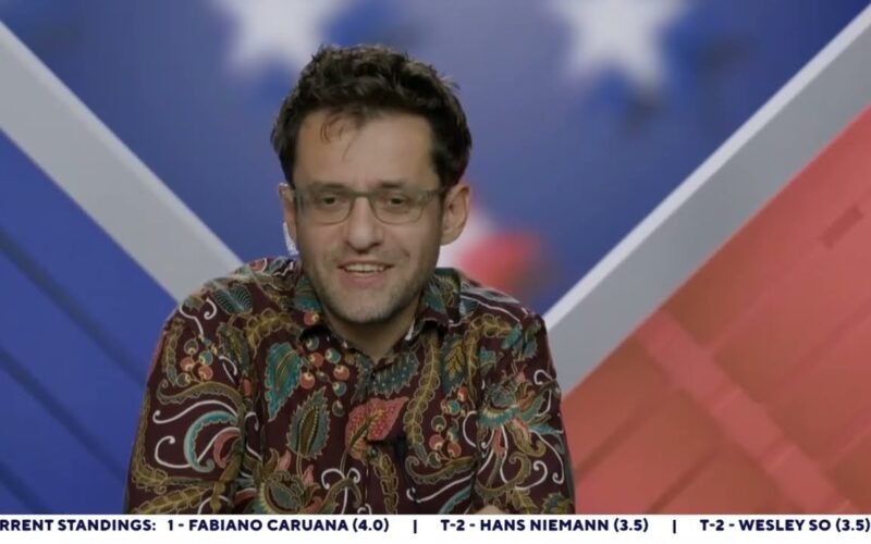 Levon Aronian talks to the team after a draw against Wesley So in the sixth round of the 2023 U.S. Championships.