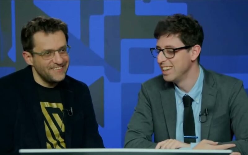 Levon Aronian talks to Kostya Kavutskiy after snatching a 2-0 lead over Robson in their first Champions final games at The American Cup 2024.