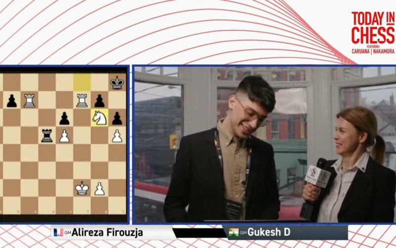 Alireza Firouzja talks to Anastasiya Karlovich after defeating Gukesh in the seventh round of the FIDE Candidates Tournament 2024.