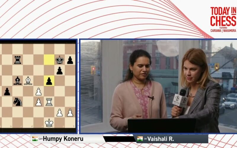 Koneru Humpy talks to Anastasiya Karlovich after defeating Vaishali in Round 8 of the FIDE Women’s Candidates Tournament 2024. 2024.04.13