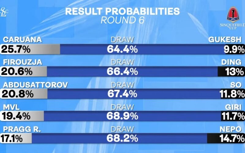 The team looks at the game outcome probabilities for the seventh round of the 2024 Sinquefield Cup, as of before play. The graphic reads Round 6, but that is incorrect. Statistics by Ben Underwood.
