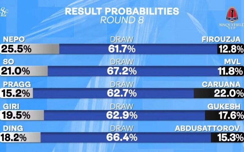 The team looks at the game outcome probabilities for the eighth round of the 2024 Sinquefield Cup, as of before play. Statistics by Ben Underwood.
