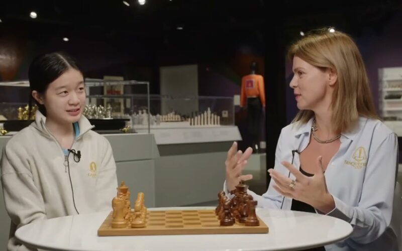 Alice Lee talks to Anastasiya Karlovich after defeating Krush in Round 8 of the 2024 U.S. Women’s Championship.