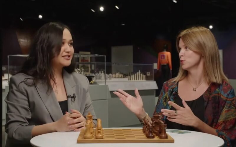 Begim Tokhirjonova talks to Anastasiya Karlovich after defeating Krush in Round 9 of the 2024 U.S. Women’s Championship.