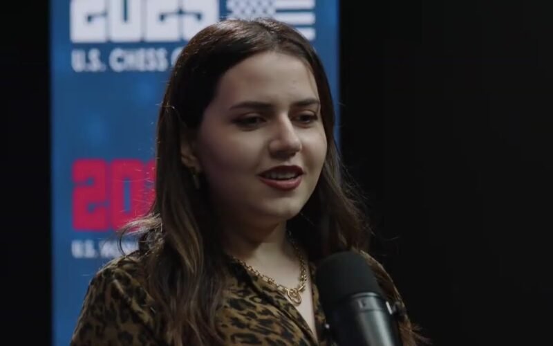 Anna Sargsyan talks to Anastasiya Karlovich after defeating Atwell in Round 1 of the 2025 U.S. Women’s Championship.