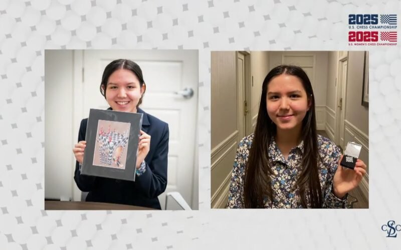 Q Boutique Manager Jennifer Karau talks to Anastasiya Karlovich during Round 9 of the 2025 U.S. Chess Championships.