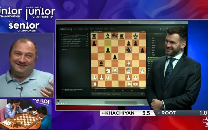 Melik Khachiyan talks to Cristian Chirila after defeating Doug Root in the sixth round of the 2023 U.S. Senior Championship. 2023.07.21 USChessChamps.com