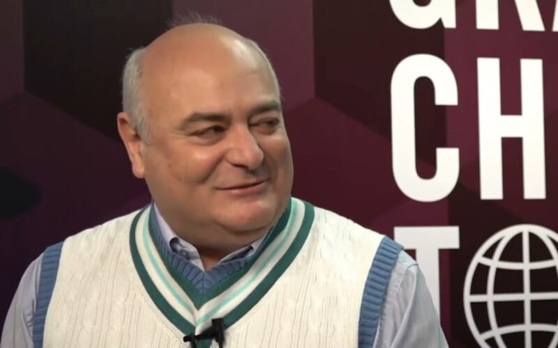 Grand Chess Tour Executive Director Michael Khodarkovsky talks to Cristian Chirila during the second blitz day of the 2023 SuperUnited