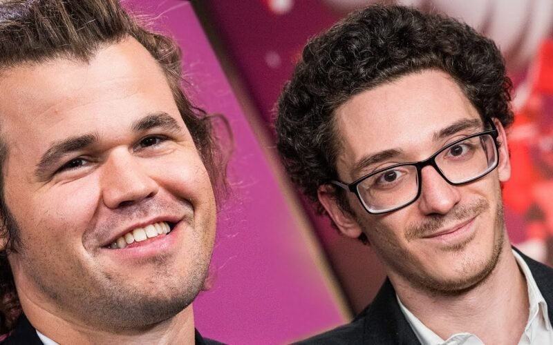Fabiano Caruana talks to Cristian Chirila after defeating Carlsen in the fourth rapid game of the 2023 SuperUnited Rapid &
