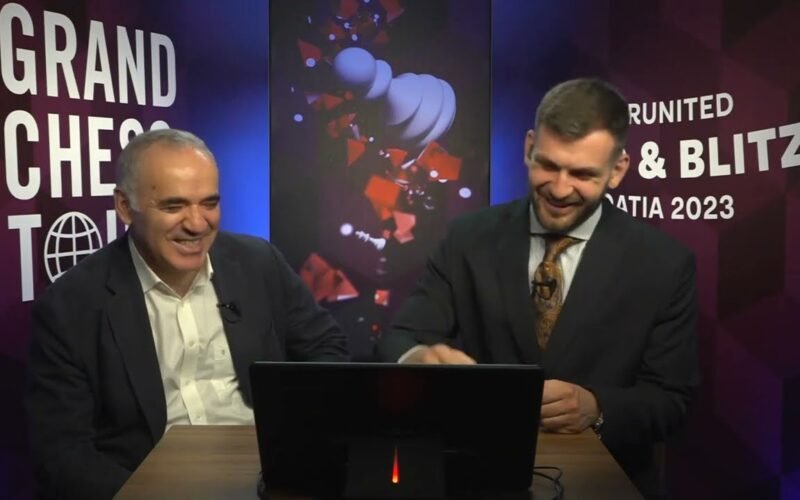 Grand Chess Tour Founder Garry Kasparov talks to Cristian Chirila during the first rapid round of the 2023 SuperUnited Rapid