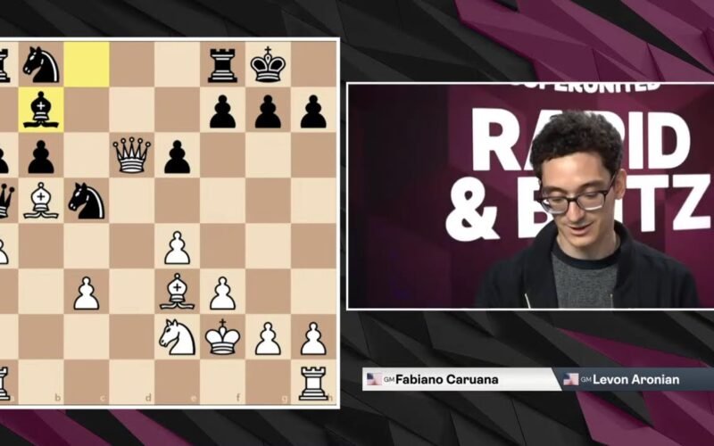 Fabiano Caruana talks to Cristian Chirila after going 2-0-1 on the second rapid day of the SuperUnited Rapid & Blitz