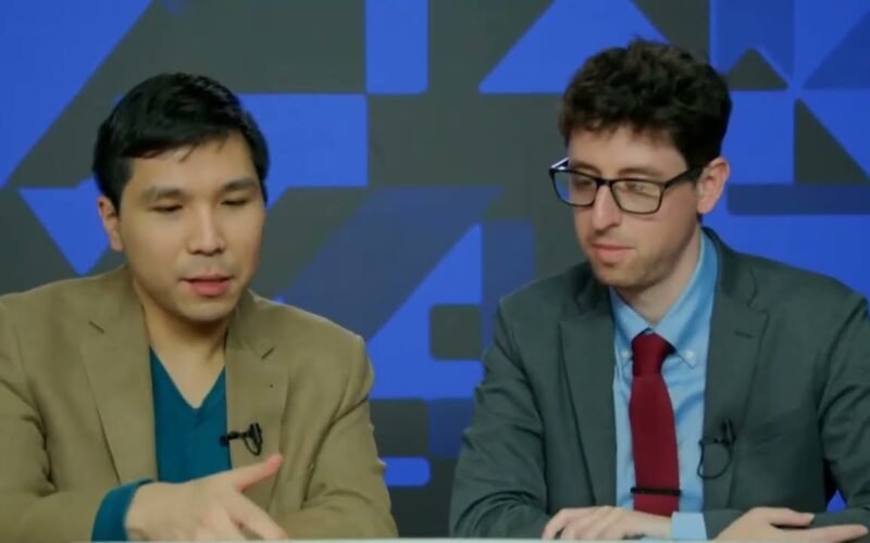 Wesley So talks to Kostya Kavutskiy after eliminating Robson 4-2 in The American Cup 2024. 2024.03.18 USChessChamps.com