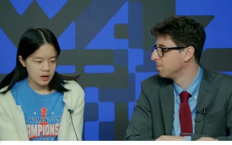 Alice Lee talks to Kostya Kavutskiy after eliminating Tokhirjonova 3-1 in The American Cup 2024. 2024.03.18 USChessChamps.com