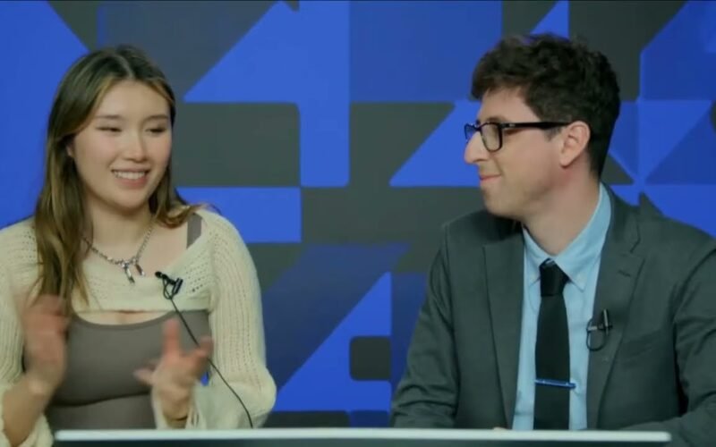 Begim Tokhirjonova talks to Kostya Kavutskiy after defeating Zoey Tang in the Elimination Bracket at The American Cup 2024. 2024.03.16 USChessChamps.com