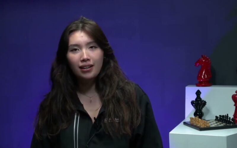 Woman Grandmaster Jennifer Yu talks to Cristian Chirila after her eighth round victory over Gracy Prasanna at the 2022 U.S.