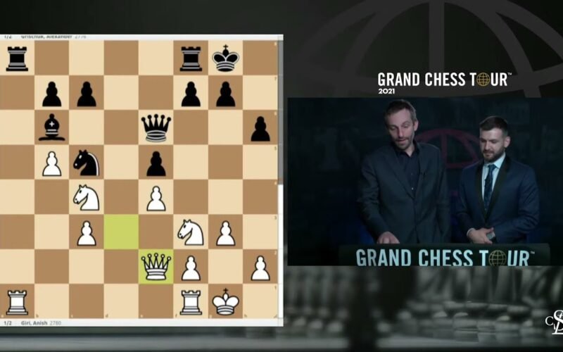 Grandmaster Cristian Chirila interviews Alexander Grischuk during the ninth round of the 2021 Superbet Chess Classic. 2021.06.14 GrandChessTour.org