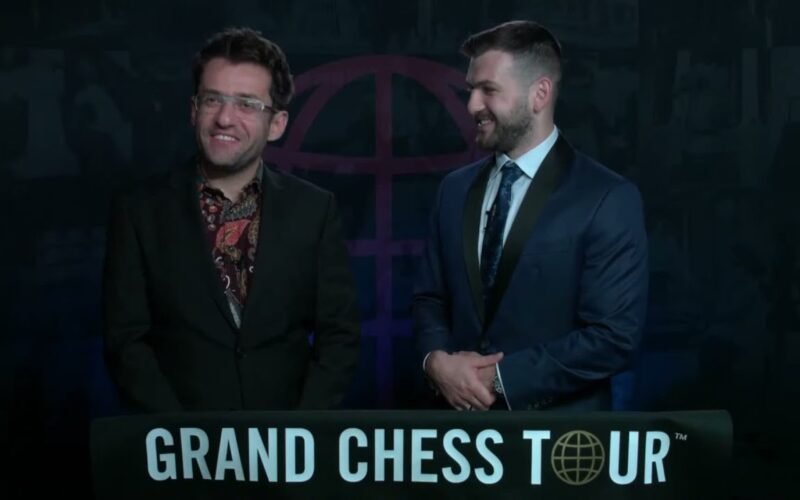 Grandmaster Cristian Chirila interviews Grand Chess Tour Executive Director Michael Khodarkovsky during the ninth round of the 2021 Superbet Chess
