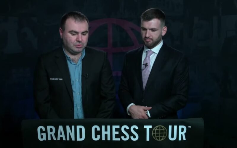 Grandmaster Cristian Chirila interviews Shakhriyar Mamedyarov during the seventh round of the 2021 Superbet Chess Classic. 2021.06.12 GrandChessTour.org